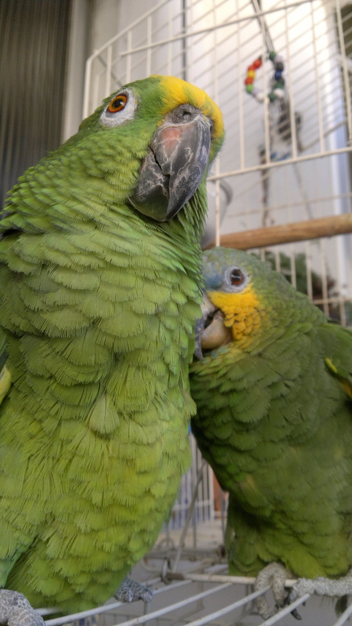 Blue Fronted Amazons are active and require cages of at least 24” x 36” x 24”, with perches, climbing toys, and space to move freely.